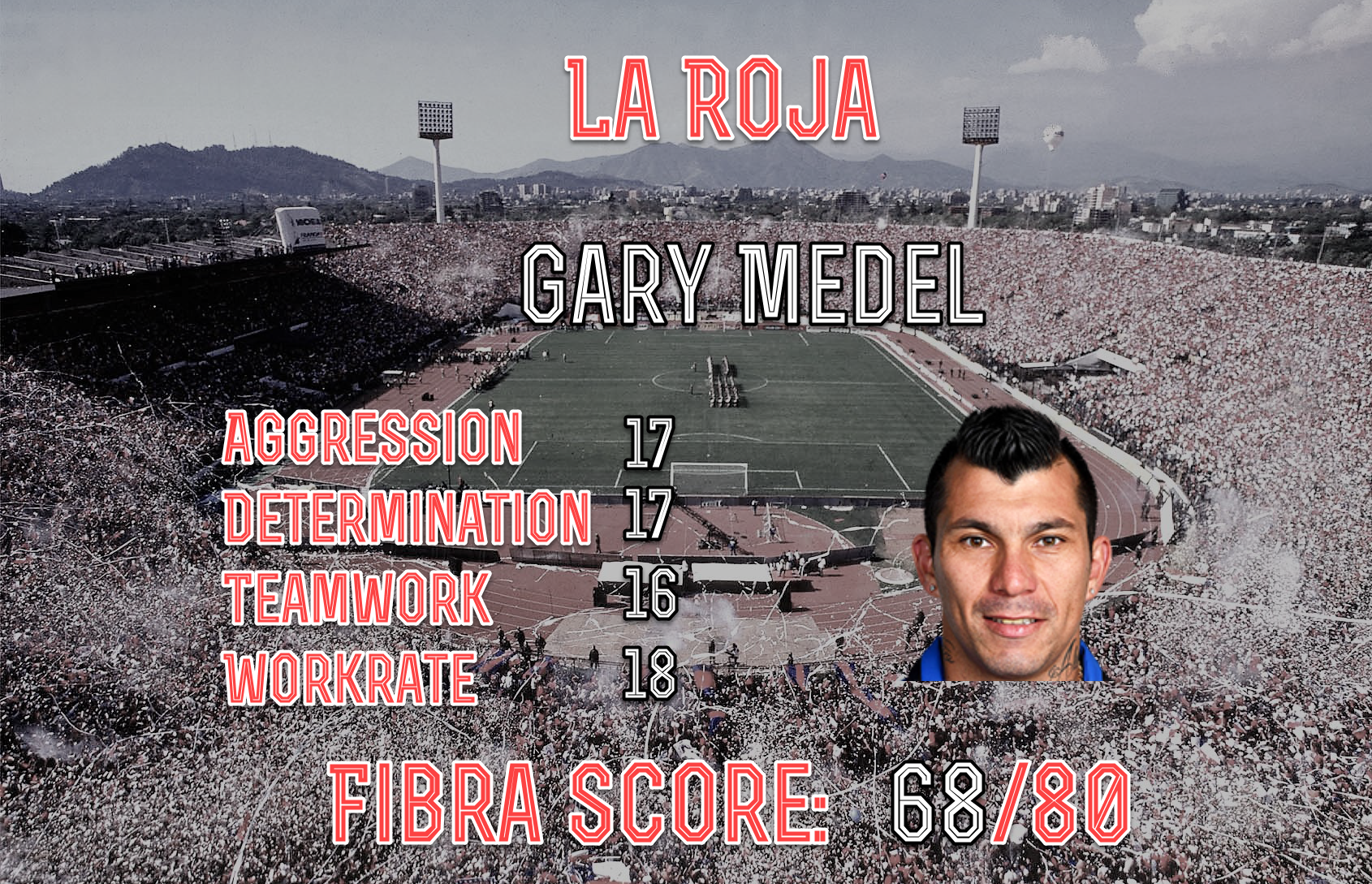 You may also see it is quite an old squad, with an average age of 29.5 years old, which I think will suit International football. Age is also a correlating factor with 'fibra' as I discussed in a previous post (see here). Obviously the standout players are Sánchez & Vidal, but there are some nice surprises in this squad...including ex-Utd and Wigan Striker Ángelo Henríquez who has developed into a great clinical striker: