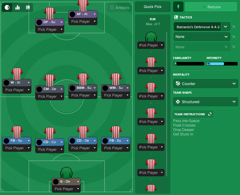We're looking like an El Bastardo 442 or 4411 - something simple to start off with, on which I can build upon. I may also look to have a dirtier version for the big crunch games Vs the likes of Boca and River....perhaps go 4141 and deploy anti-fútbol in all its glory :-)