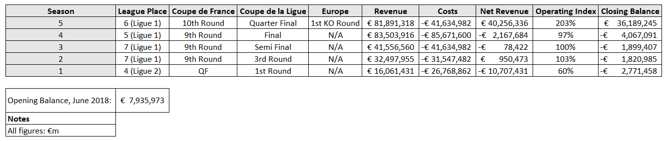 Our fifth season (2022/23) brought European football to Stade du Moustoir and I always knew it would bring some much-needed money into the bank balance. With Europe came a 136% increase in TV Revenue and an extra seven home games (of which five were maximum capacity sell-outs).