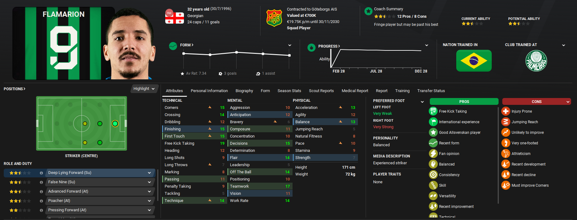 Flamarion. Flamarion Jovino Filho. Born in Campo Grande in Brazil in 1996. He played for Internacional and Palmeiras but he moved to Montenegro in 2016 and he moved to Dinamo Batumi in Georgia a year later. He spent 9 seasons here within my save and he also took Georgian citizenship and played 24 matches for their national team, scored 11 goals.