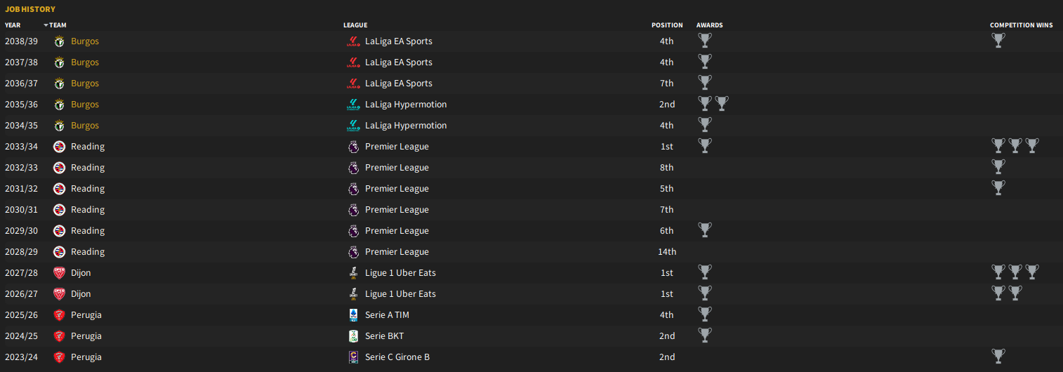Perugia, Dijon, Reading, Burgos. Four clubs in sixteen in-game years. My saves in the previous two editions were around ten seasons, so this one was longer. But we all know it was because of the cancellation of FM25.