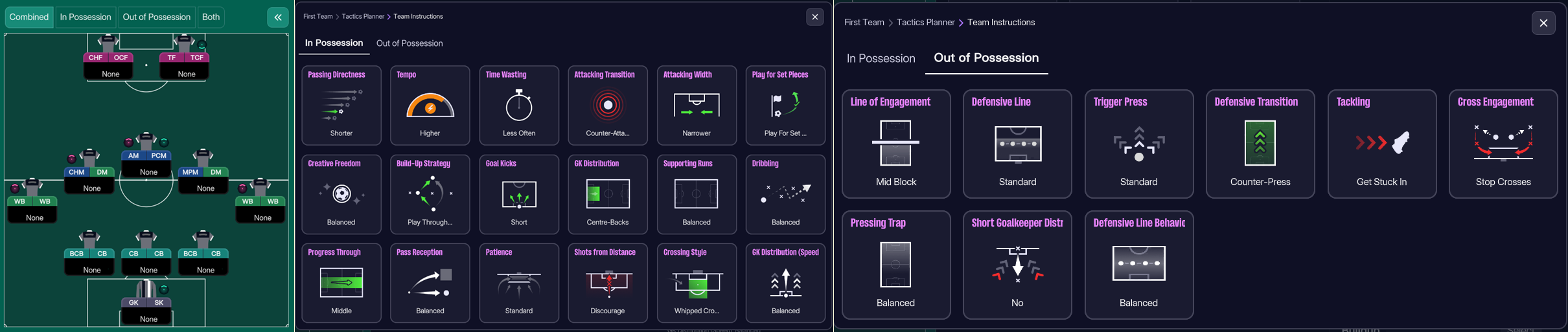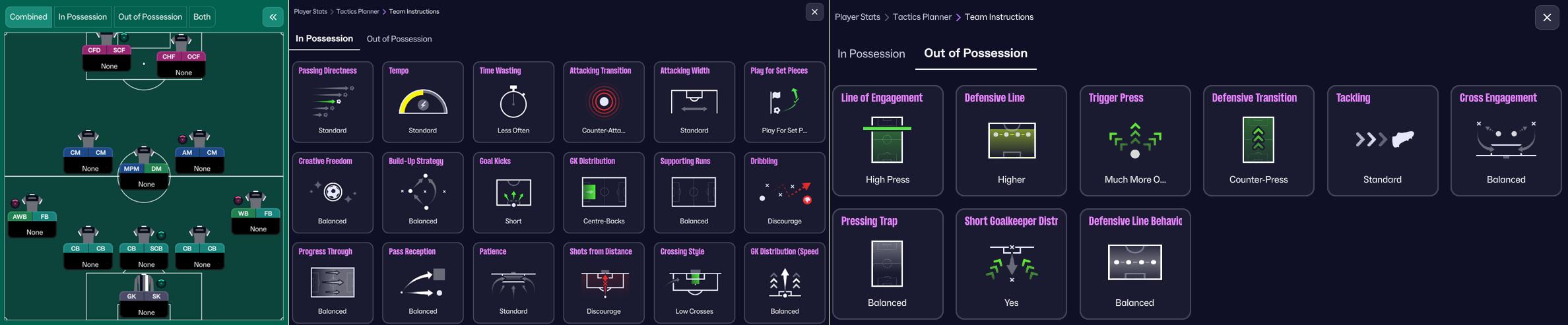 I did a couple of tactical changes before the 2027/2028 season compared to the previous one I shared above. I did some more tweaks during the first league rounds, as I didn’t like our hyperactive and chaotic approach, mainly because of the out-of-possession instructions hyped too much.