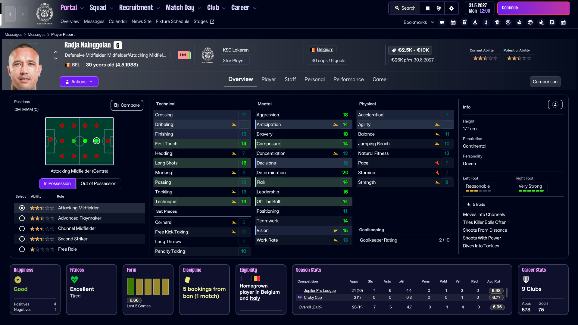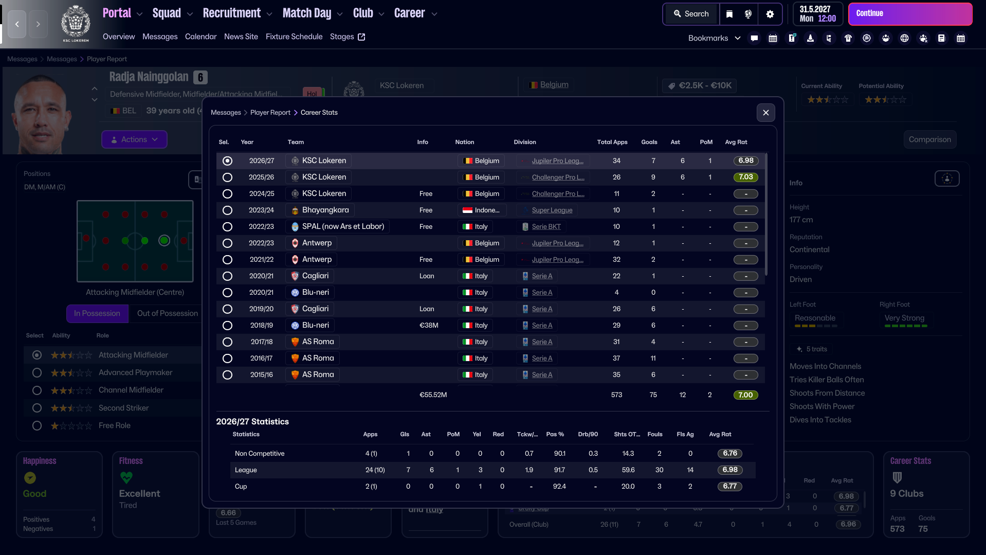 The season 26/27 was the last one for my biggest star - at least by the name. Midfielder Radja Nainggolan retired from playing at the age of 39. He made 26 appearances, scoring 9 goals and making 6 assists in the first season when we won the promotion. He was able to participate in all 34 league matches in the top tier. He scored seven goals and made six assists.