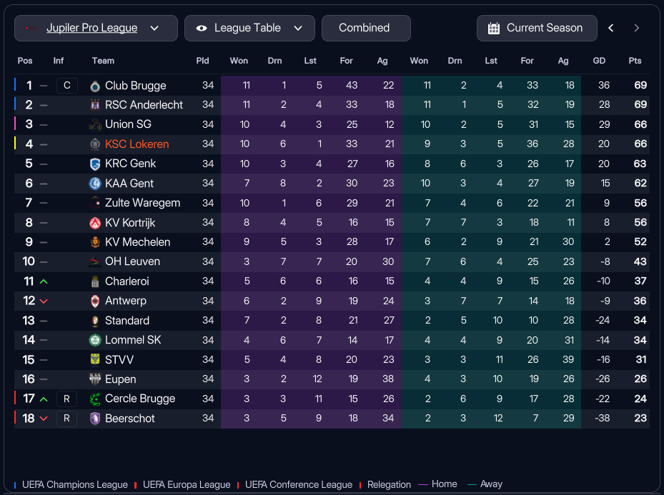 We fought about the Conference League slot until the last league round. But a 1:4 defeat in the last match of the 26/27 season against Anderlecht meant we dropped to the final 6th position. Club Brugge lost in Gent, but OH Leuven lost to Union SG = Club Brugge retained the title despite the first three teams having the same points. Interesting end for all. We exceeded the expectations 100%.