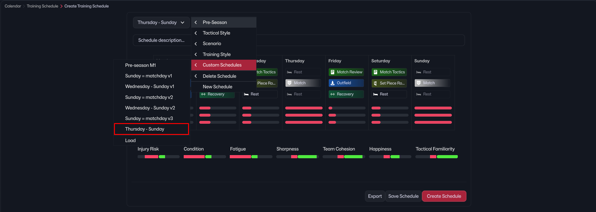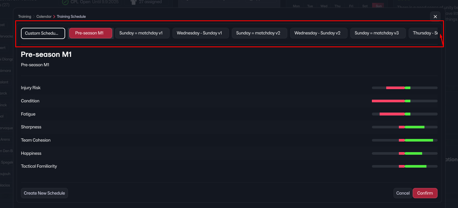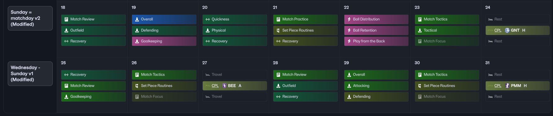 The style/system of the weekly schedule is not so much different if you had Saturday as a matchday. It will only move by day(s). That means I will have Post-match Sunday, Warm-up Monday, Never skip Tuesday, the match practice will be on Wednesday, etc.