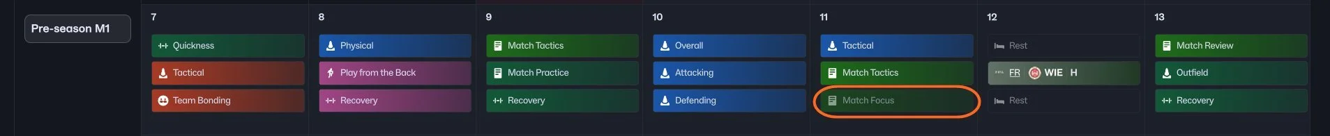 The pre-match is an easy day in comparison with previous days. Just match tactics session and set pieces. Plus match focus session that is automatically added by the game. This means if you add anything here, it will be replaced by the match focus.