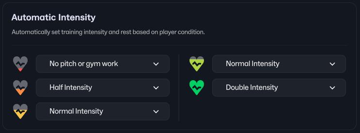 I kept the set-up of the Training Intensity the same as I had it in previous versions of the game. That means it’s all set to the Automatic Intensity - “Automatically set training intensity and rest based on player condition.”